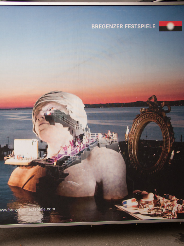 Een biertje gedronken op het terras, gedoucht en later om 18.00 uur richting Bregenz gefietst. Heerlijk gegeten en daarna nog over de boulevard gefietst. De Bregenzer festspielen worden deze week gehouden. Een spektakel op het water. Nu met een gigantisch hoofd als attribute.