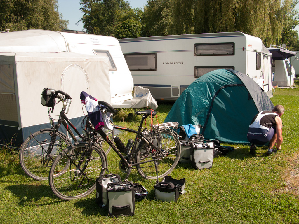 De tent afgebroken en op het terras ontbeten. Om 09.45 uur vertrokken. Omdat we ons einddoel gisteren bereikt hebben en nog niet in ons pensionnetje kunnen, hebben we besloten om alvast de Zwitserse kant van de Bodensee te fietsen richting Konstanz.