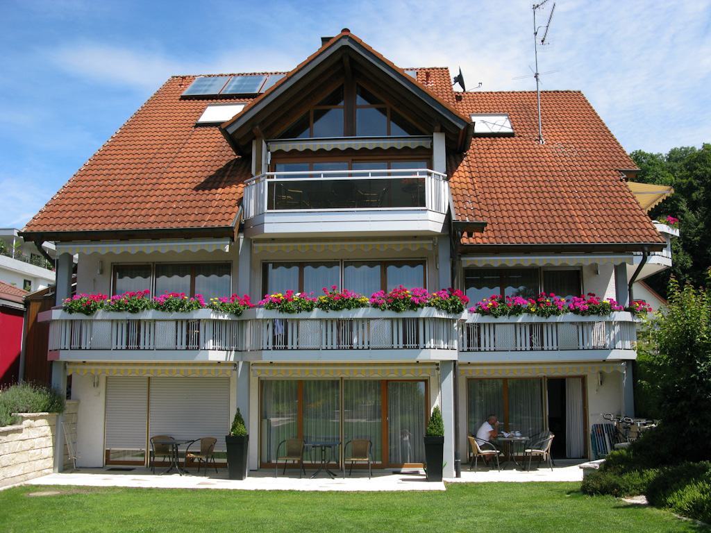 Langs het westelijk punt van de Bodensee gefietst, Ludwigshafen. Om 14.00 uur waren we al bij ons appartement, waar we hartelijk werden ontvangen door mevrouw Heitzmann met koffie en water. Ons appartement, op de foto rechtsonder, is schitterend!