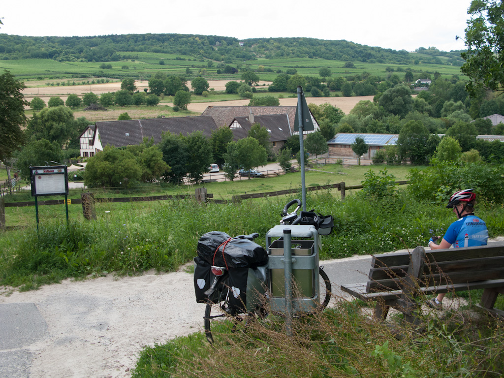Helaas was het bett+ bike beneden in het dal gesloten. Dus de klim weer naar boven gemaakt en doorgefietst naar Schwabenheim. Ook hier was alles tot 17.00 uur gesloten. Er was niet eens  een terrasje open! Dus maar weer doorgefietst naar Elsheim. Om 17.00 uur kwamen we aan bij Gästehaus Hochmann in Stadecken, waar we zeer leuk ontvangen werden. Het pension heeft verschillende kamers, wij kiezen voor de blauwe kamer (€ 67) en drinken buiten een biertje door de eigenaar aangeboden. Het smaakt heerlijk, zeker in de zon.