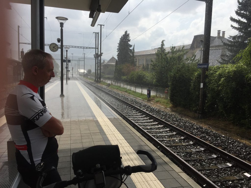 De Zwitserse douane was nergens te zien! Vanaf de grens tot aan het meer van Biel liggen er vier bergplooien die samen de keten van Jura vormen. We besloten om naar Courgenay te fietsen en daar op de camping te overnachten. Helaas, deze camping was gesloten! Op dat moment kwamen er behoorlijke donkere dreigende wolken uit het het zuid-oosten. We hadden snel het weerbericht bekeken. Dat beloofde niet veel goeds. In dit dorpje was gelukkig ook een stationnetje. Hier besloten we om de trein te nemen naar Biel. Dit bleek een goede keuze. Ik had nog maar net de kaartjes gekocht en het begon te regenen en ook te hagelen.