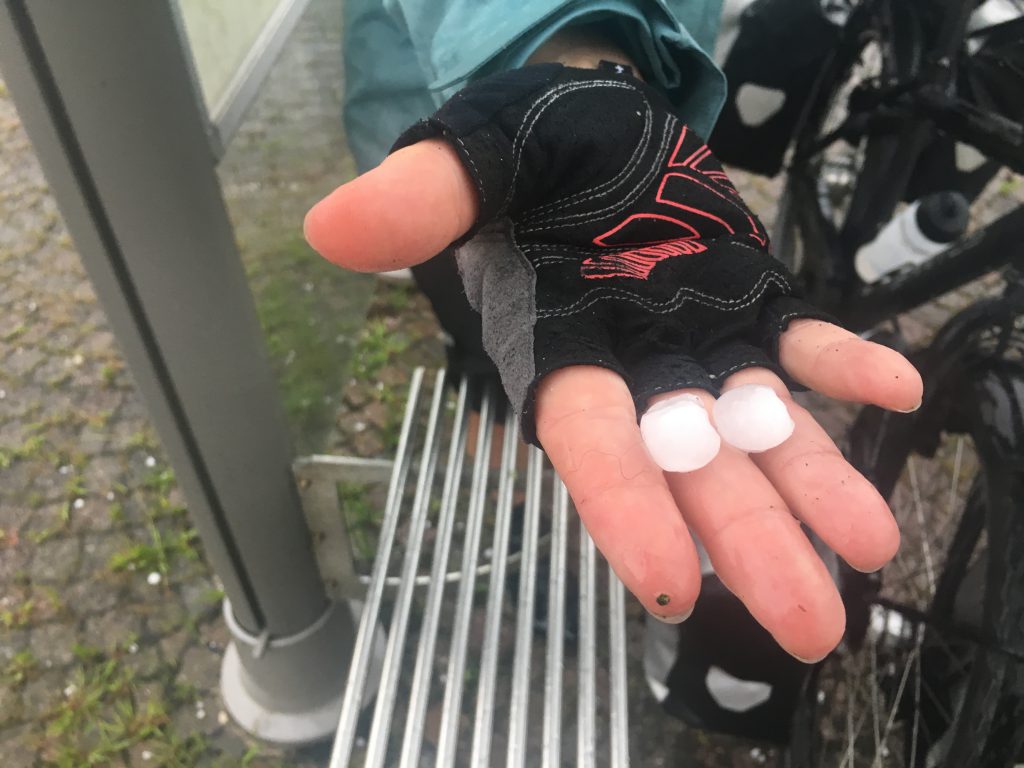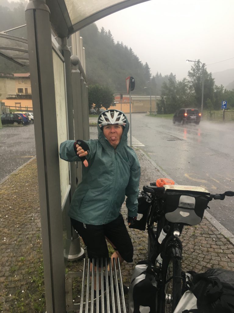 Om 13:00 werd het plotseling ander weer. Het dreigde te gaan regenen. Misschien als we door fietsten bleven we de bui voor. Voorbij Borgosesia begon het behoorlijk door te regenen. Bij een bushalte in Crevacuore konden we schuilen. Regenjassen, rainlegs en overschoenen aan! Wat een regen en later ook behoorlijke hagelstenen.