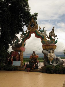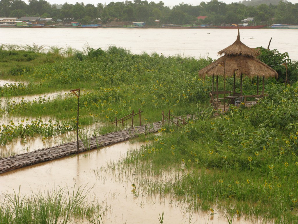 Helaas begon het weer te regenen om 16.30 uur en konden we er niet uit om naar Chiang Saen te fietsen. Chiang Saen is een oud stadje met 19e eeuwse muren, pagoden en gebouwen. Morgen fietsen we door Chiang Saen en zullen het dan maar bekijken. Het is inmiddels 18.00 uur en het regent nog steeds behoorlijk. Ik ben benieuwd of het leuke bamboebruggetje dat naar de Mekong leidt morgen nog begaanbaar is! Tot morgen.