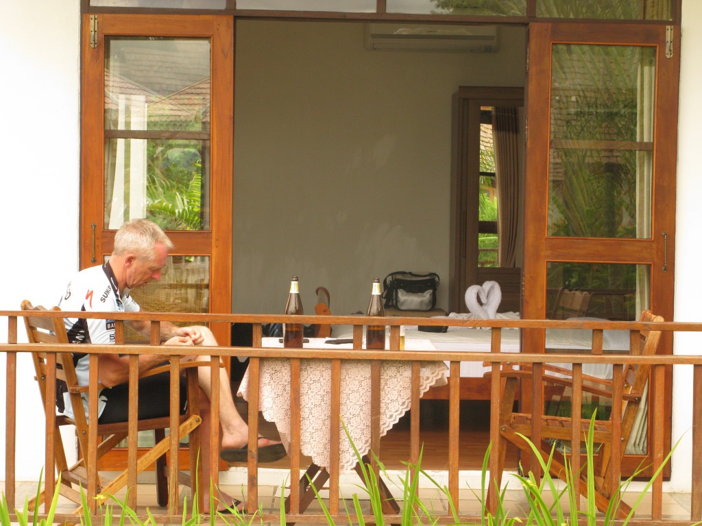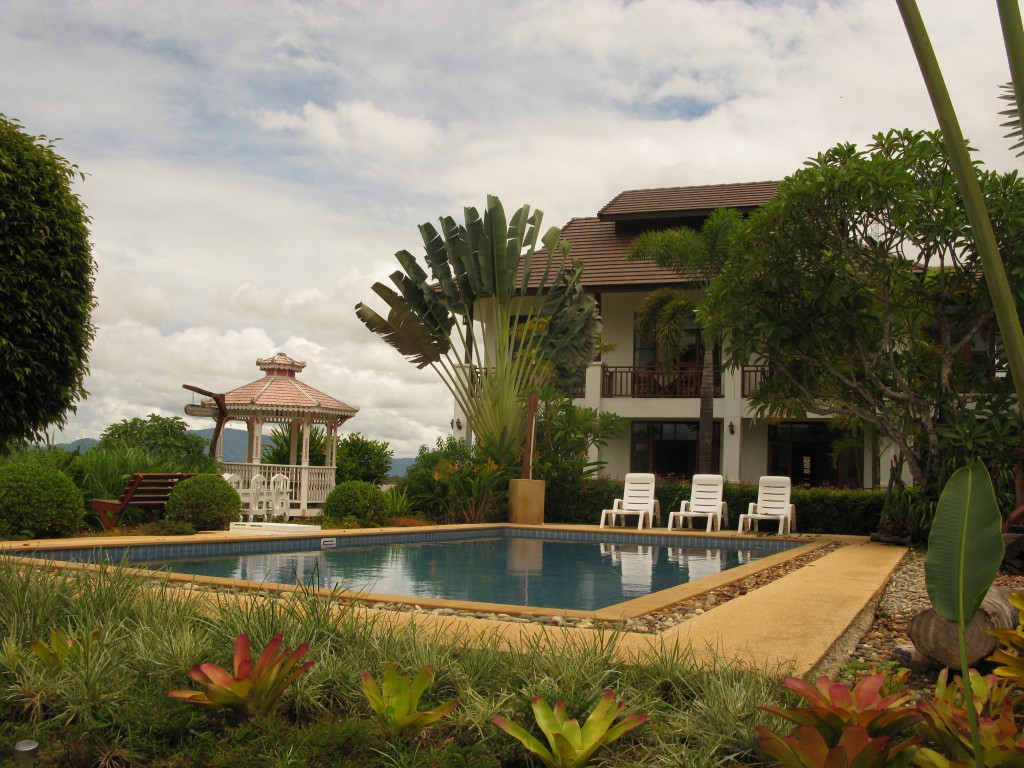 Het weer is zelfs warm en rond 13.00 uur zag Andri ons huidige onderkomen met zwembad, “Gin’s Maekhong Vieuw Resort & Spa”. We kregen een prachtige kamer, dronken een biertje (0,630 liter haha) op het terras van onze hotelkamer en namen een duik in het zwembad met prachtige tuin.
