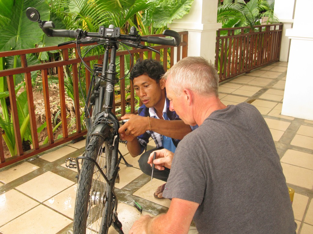 Daarna hebben we duizenden mieren, die op Andri zijn fiets zaten verwijderd met een spuitbus gif! De koplamp van zijn fiets zag zwart van de mieren. Hij had de mieren twee dagen geleden al meegenomen vanuit het Mae Chan, en vond het nu wel welletjes!