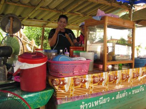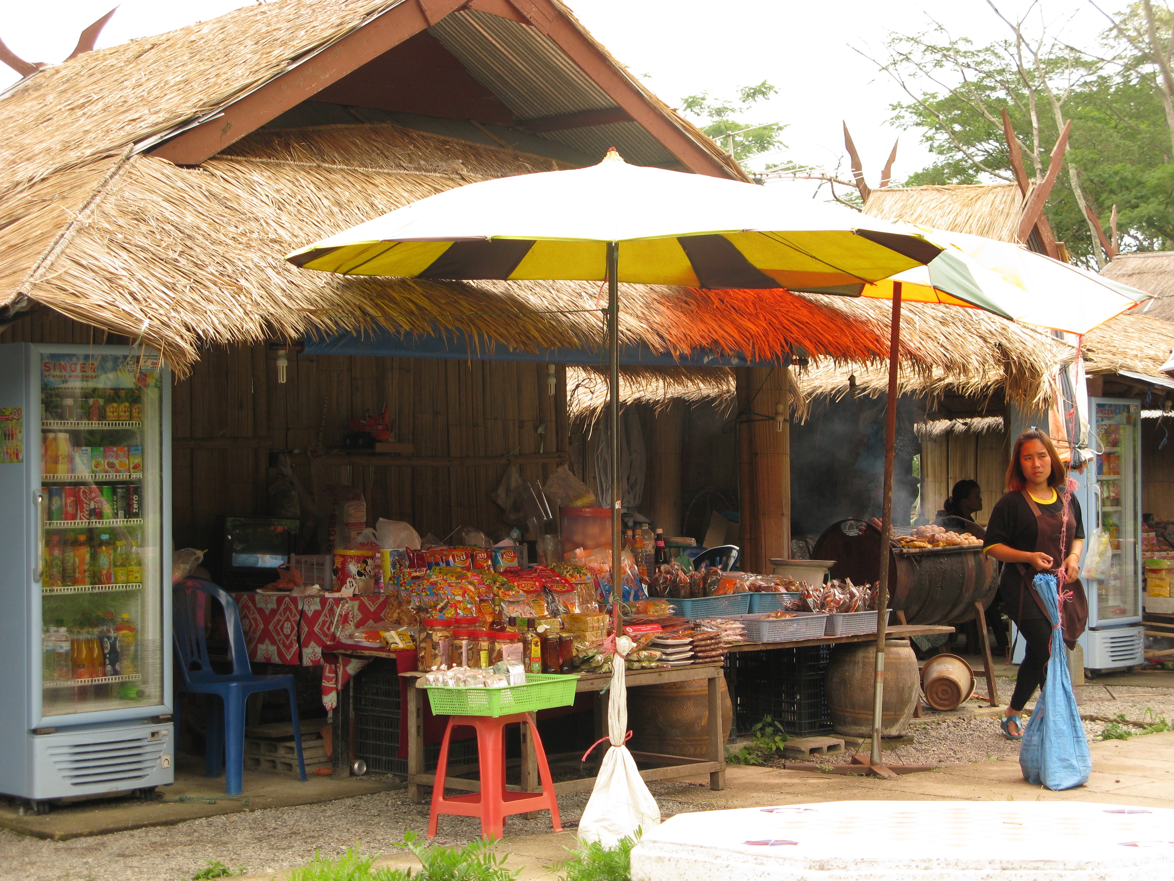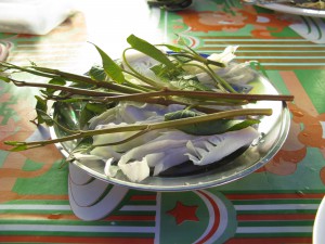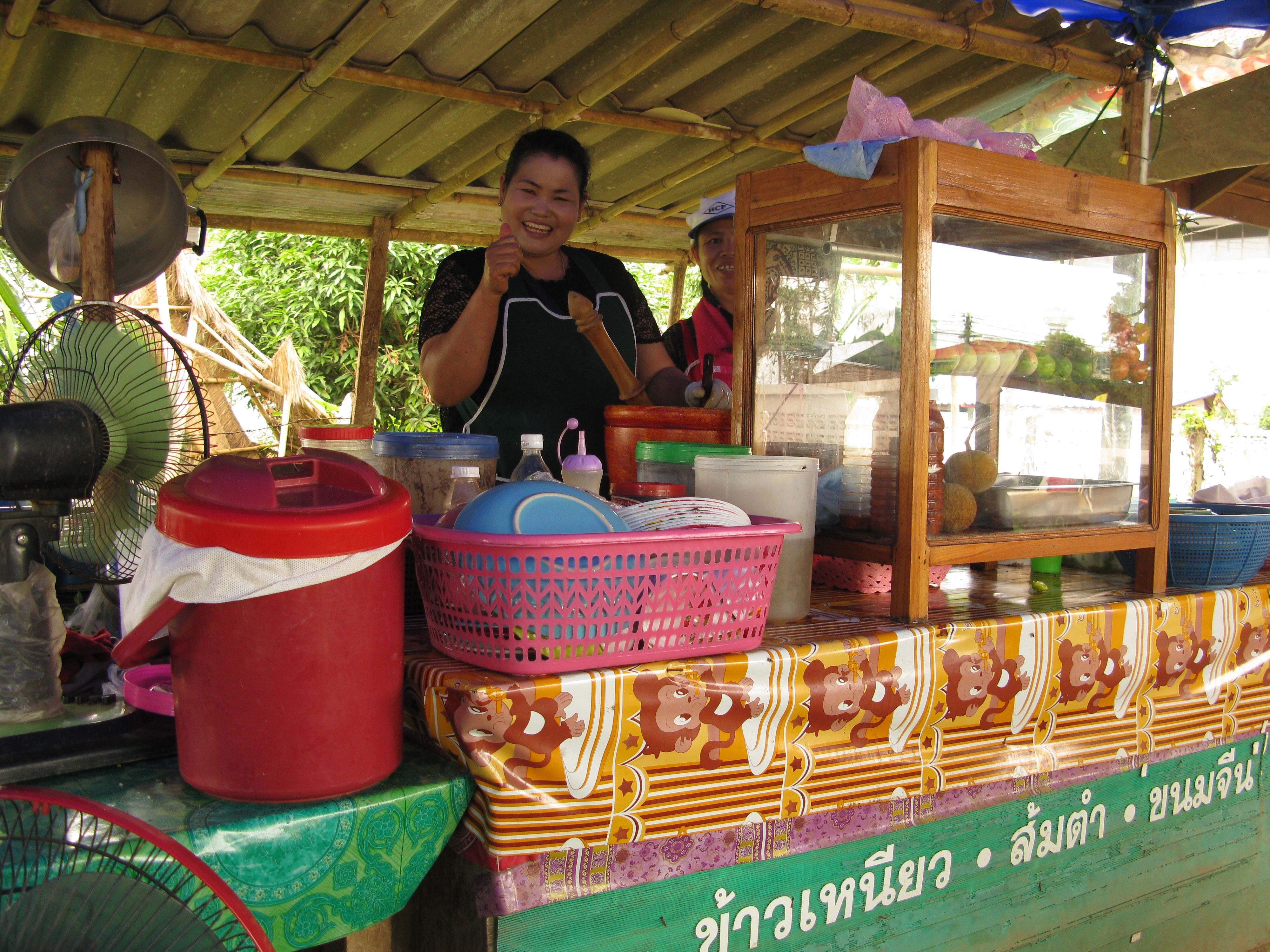 We hadden inmiddels al 60 km erop zitten en kwamen in het dorpje Wang Nua. Hier hebben we Som Tham gegeten (een erg pittige papaya-salade). Hierbij kregen we ook een bordje met kool en wat groen stengels.