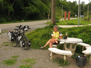 We waren redelijk snel van de drukke weg af en fietsten via een landelijke weg naar het begin van de 11 km lange klim (5 tot 10%). De klim was best pittig maar zeker te doen. De zon kwam er weer door. Op de top een geweldig uitzicht op het meer van Phayao. De klim was best te doen. Voor Andri van het een 1 en voor Henny een 2. ( De Zwitserse dames in My Dream, dag 10, hadden een gradatie van een zware dag: een 1 als je het vanaf het begin erg leuk vindt, een 2 als je het ‘s avonds na afloop toch leuk vindt, een 3 als je het na een jaar het best wel leuk vond en een 4 als je het helemaal niks vond.) Hier hebben we een knoflookworstje aan spit gegeten en gedroogde mango’s.