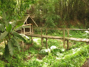 De dame van het stalletje zei dat het “aroy” was, wat verrukkelijk betekent. Dat was ook zo en het bluste tevens het pittige eten. Er volgde gelijk een klim van 3 km met een hellingspercentage van 10 tot 13%, pffffff…. De zon bleef volop schijnen. Het was dus behoorlijk zweten! Een mooie afdaling leidde ons naar de vallei waar ons overnachtingsadres was. Dit lag 6 km van de route af maar is zeker de moeite waard. Rond 16:00 kwamen we aan bij Cabbage & Condoms. De naam suggeert wat anders maar het is er goed vertoeven.