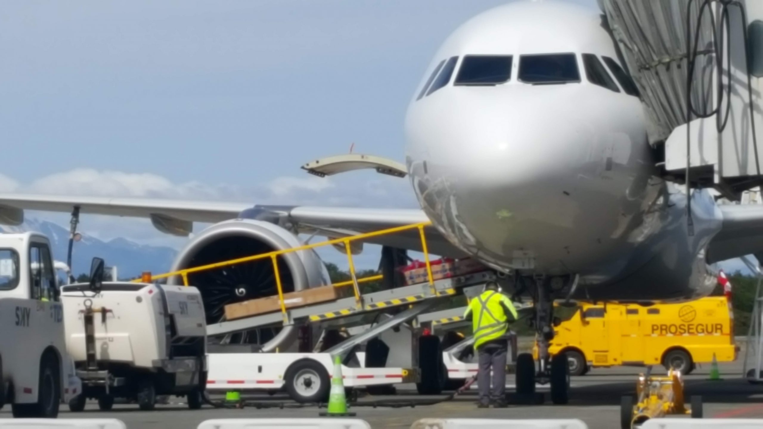 Maar met wat tape is de doos gerepareerd en hebben we de fietsen bij de vliegmij Sky netjes afgeleverd. Hé daar zijn nog 2 andere fietsdozen richting Puerto Montt!