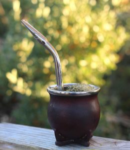 Gisteren een les ‘mate’ drinken in Gaucho style gehad van Nacho, de eigenaar. Het was een ceremonie waarbij een klein kopje/kalabas (cuia) met een rietje (bomba) gevuld wordt door de heer des huizes met blaadjes en knoppen van de mateplant. Daarop wordt 80 graden water geschonken. Het kopje gaat naar de eerste persoon en wordt als het leeg is teruggegeven aan de heer des huizes. Hij vult het weer aan met water en geeft het door aan de volgende persoon. Het gezamenlijk drinken van mate staat voor vriendschap en gemoedelijkheid tussen de drinkers. Andri vond het lekker ? maar ik niet?. Het smaakte bitter en had een typisch rokerige smaak.