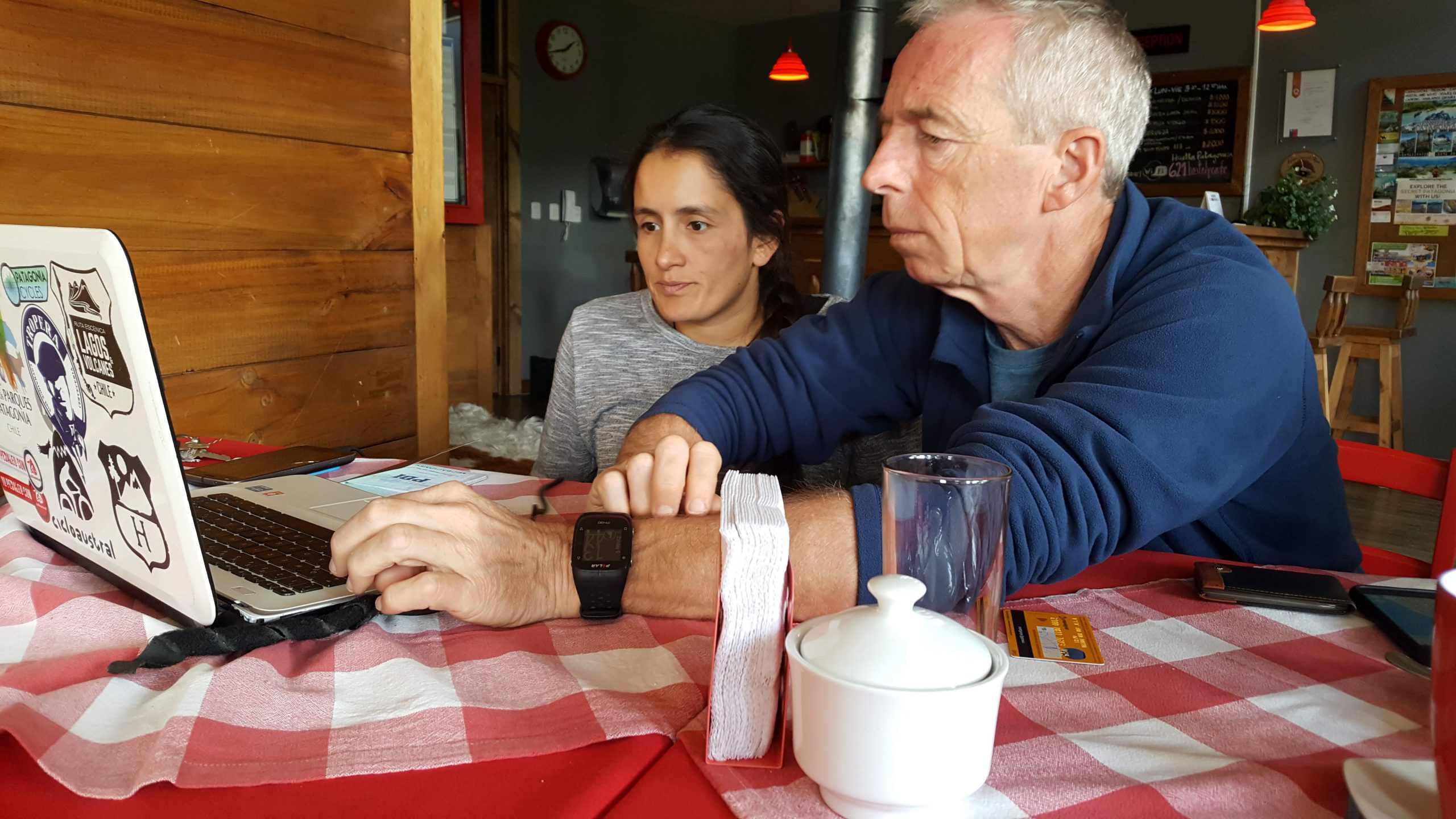 Gisteravond hebben we heerlijk gegeten bij Mama Gaucho. Vanochtend hebben we uitgebreid ontbeten in de cabaña. Begin van de middag hebben we samen met Claudia de campings geboekt in de het natuurreservaat Torres del Paines. Je moet een reservering hebben anders kom je het park niet binnen! We zijn pas op 10 februari bij dit park. Het kan maar geboekt zijn. Claudia hebben we leren kennen bij de fietsenzaak Patagonia Cycle. Zij wil graag onze backup zijn bij eventuele problemen op onze route. Zij kent de route en heeft overal connecties. Dat is super fijn!