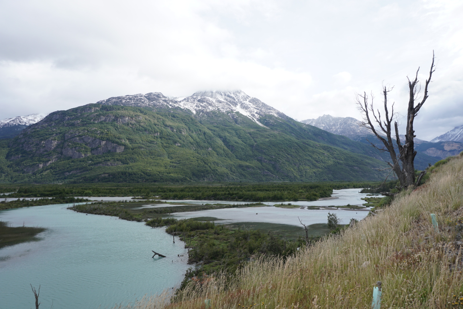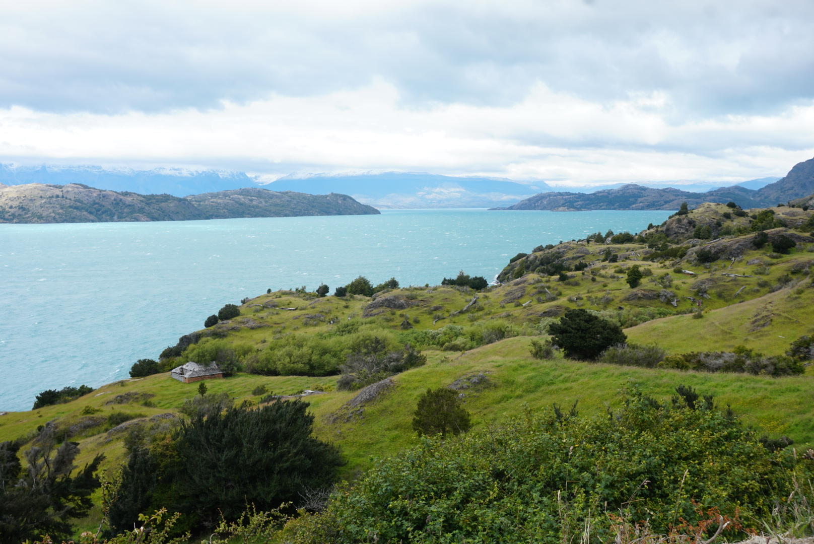 Zij vonden dat geen probleem en we zijn zelfs 120 km meegereden tot aan Puerto Rio Tranquilo. Dit plaatsje ligt aan het grootste meer van Chili, Lago General Carrera. Dit meer wordt gedeeld door Chili en Argentinië. Het meer is van ijzige oorsprong en wordt omringd door het Andesgebergte. We reden lange stukken langs het prachtige meer en vonden het heerlijk om niet te hoeven fietsen.
