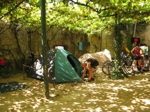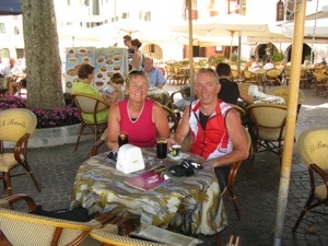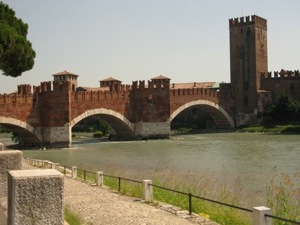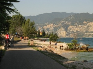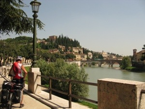 Vanochtend zijn we om 08.00 uur vertrokken na een heerlijke nacht. Het blijkt dat het aan het Gardameer veel waait, vandaar ook al die surfers! We fietsen langs de oostoever via Malcesine naar Garda. Omdat het vroeg is, is het nog niet zo druk en het verkeer in de tunnels viel mee. in Garda komen we aan de praat met een ober en hij adviseert ons om door te fietsen naar Lazise en daar de SP5 te nemen naar Bussolengo. We zijn blij als we weer op de route zijn. Langs het kanaal fietsen we Verona in en zoeken de aangegeven camping San Pietro. Hiervoor moesten we wel 800 meter tussen de 7 en 10 % klimmen! Om 14.45 uur komen we op de camping aan. Het blijkt een camping te zijn tussen burchtruïnes met een super mooi uitzicht over Verona.