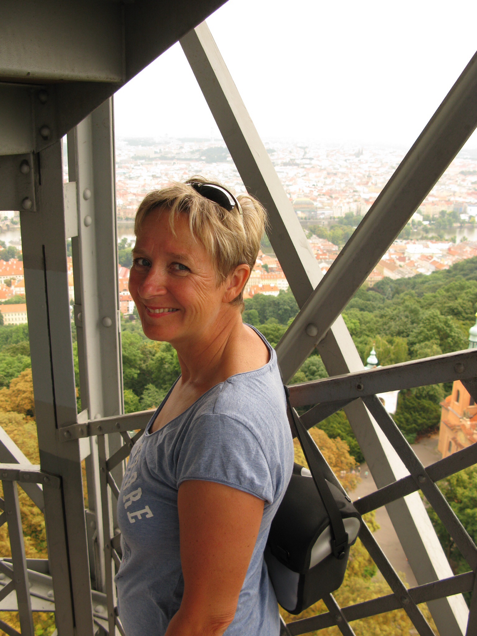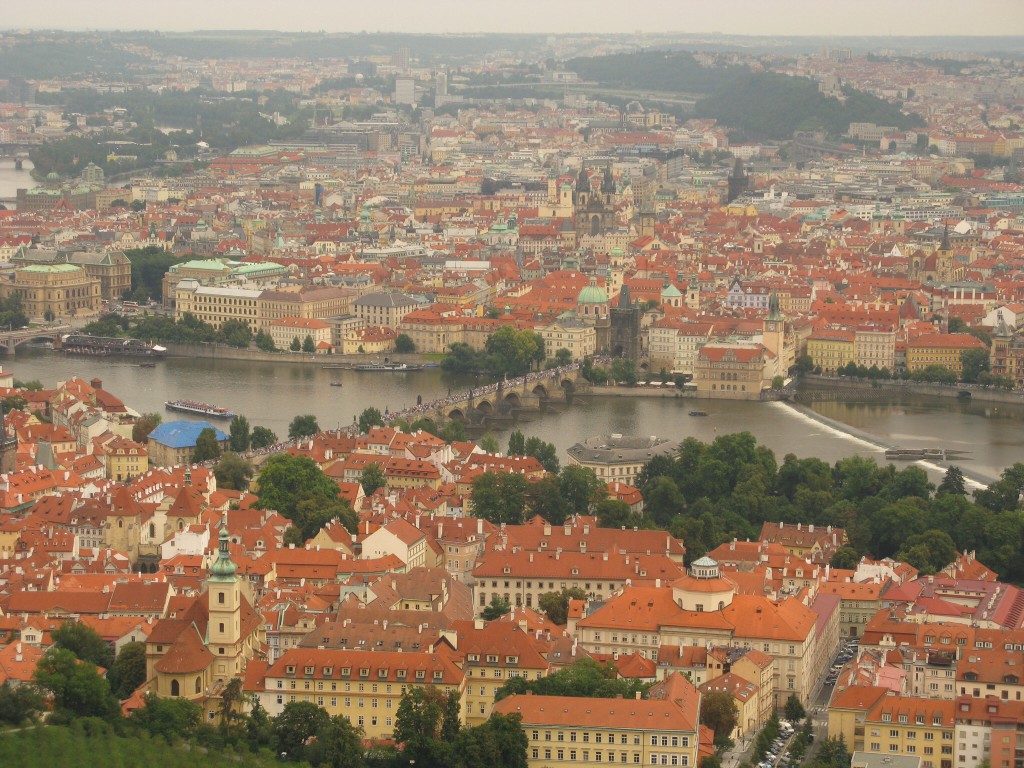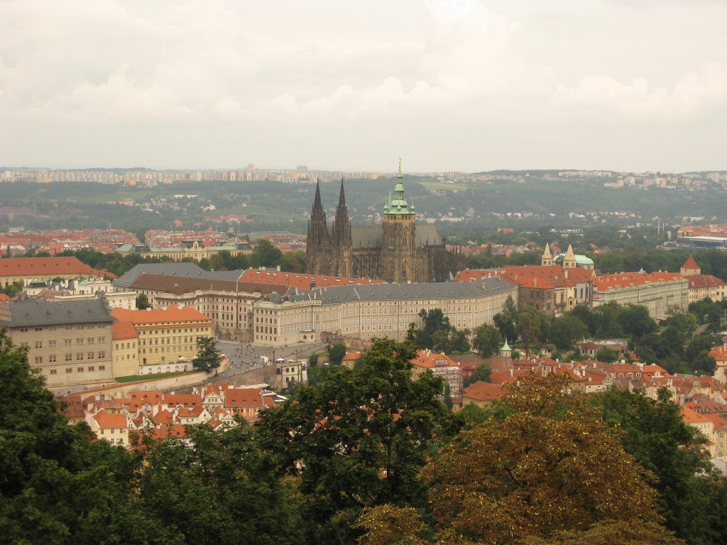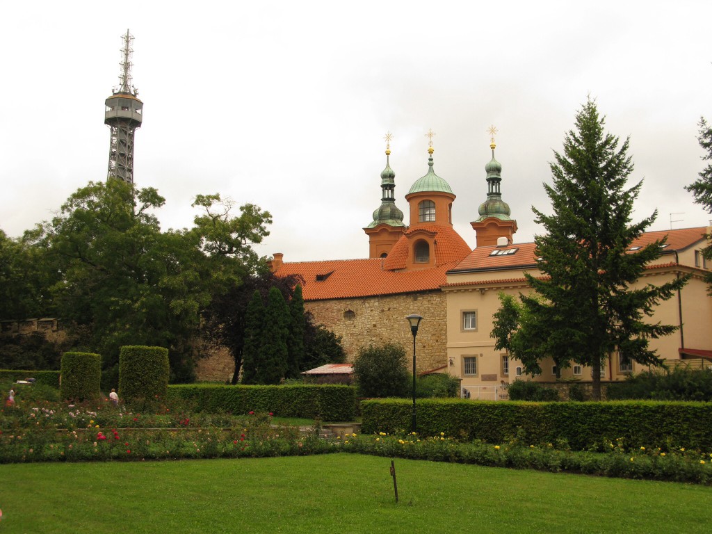 Daarna door naar de Botanische tuin maar die viel tegen. We maken daarna een prachtige wandeling door het park Petrin ( 327 m hoog) waar vele Pragenaren graag vertoeven. De weg naar de top loopt langs de gotische Hongermuur uit het jaar 1360. De legende wil dat Karel I deze na een misoogst liet bouwen als onderdeel van de stadsverdediging. Duizenden hongerigen werden zo aan het werk geholpen. Ze kregen als beloning levensmiddelen uit de koninklijke voorraadkamers en werden op die manier gevoed. Boven op deze berg staat een uitkijktoren. Dit is een kopie van de Eiffeltoren in het klein (63,5 m en 299 treden) en geeft een mooi uitzicht over de stad.