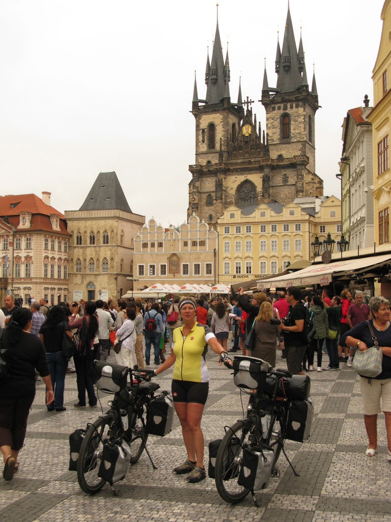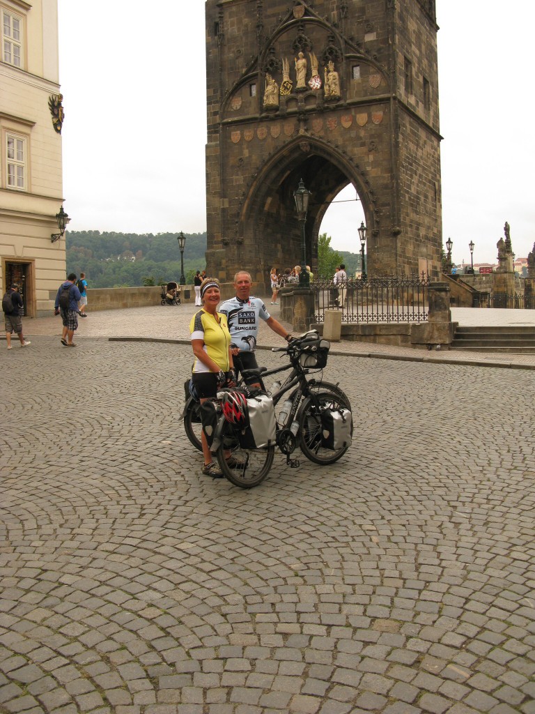 We hebben weer super uitgebreid ontbeten en om 09.00 vertrekken we. Het is bewolkt maar beslist niet koud. Nog even gefietst naar het oude stadsplein met de bekende klok. Hierna nog een foto gemaakt bij de Karelsbrug omdat dit het beginpunt is van de route van Benjamins naar Venetië.