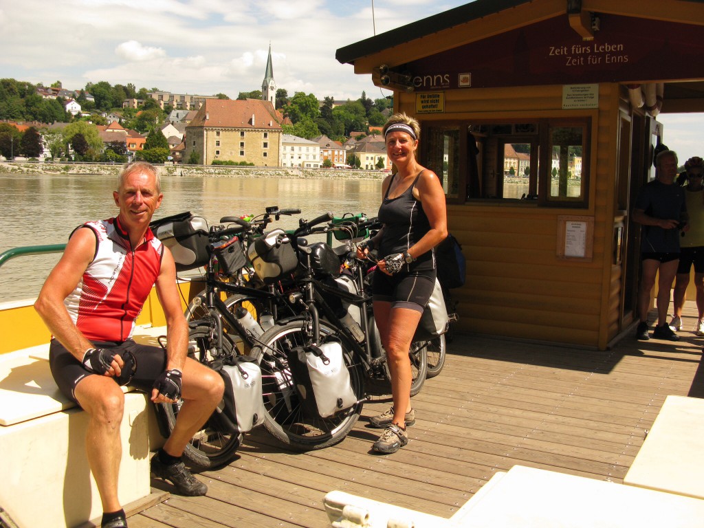 Prachtig weer, 26 gr om 09.30! Eerst nog even terug naar de route en we klimmen nog 18 km tot aan Reichenau im Mühlkreis. Daarna kregen we een afdaling door het Gusental tot Gallneukirchen. Deze afdaling is ruim 20 km. Hierna dalen we nog een paar km en komen we op de Donauvlakte. In Mauthausen steken we de Donau over met een voet- en fietsveer.