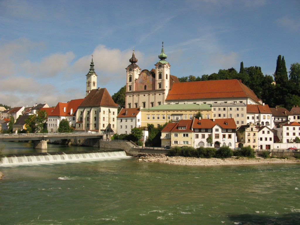 Vanochtend was de zon er al snel en we ontbijten op het terras bij de campingbaas. We fietsen naar het oude centrum van Steyr. Dit is prachtig, hier stroomt de rivier de Steyr in de Enns.