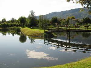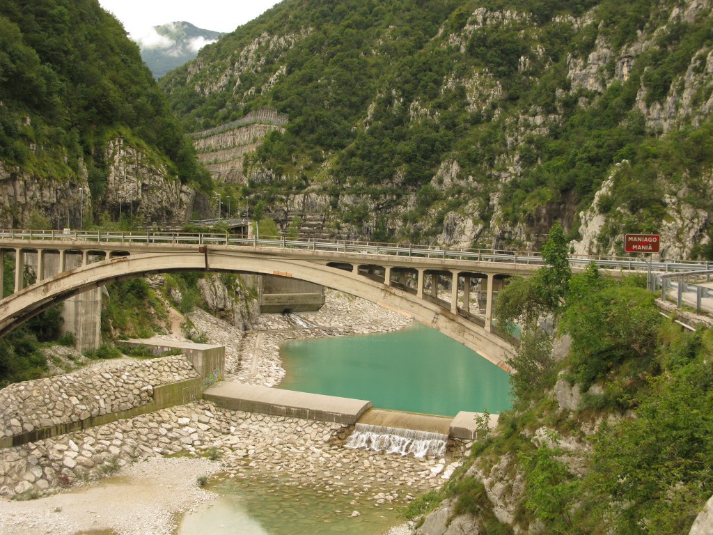Vanochtend hebben we buiten een Italiaans ontbijtje genuttigd en om 08.15 zitten we al op de fiets. We fietsen gezellig met zijn vieren. De kilometers gingen vanzelf. Het traject werd steeds makkelijker en met prachtige fietspaden. De route maakt na Lestans nog een extra slinger via Meduno om dichter langs de rand van de Dolomieten te blijven. De rivieren die. We doorkruizen hebben een merkwaardige fenomeen. Als volle rivieren storten ze uit de Dolomieten en na 2 kilometer zie je nauwelijks water meer. Het zijn slechts breed uitwaaierende beddingen vol met keien. De rivieren zijn hier ondergronds geworden en komen pas na tientallen kilometers verder weer boven de grond.
