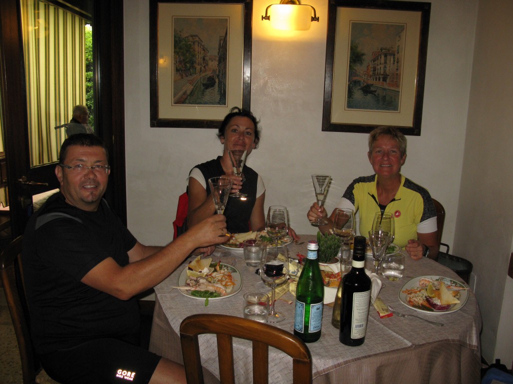 Hier is namelijk een fietsenwinkel, die morgen weer open is. Deze stad is het centrum voor het wijnbouwgebied voor de Prosecco. Hier zijn ook een van de beroemste wijnbouwscholen van Italië. We laten ons deze avond de Prosecco goed smaken.